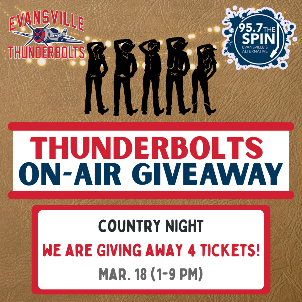 Tune in March 18th, between 1 to 9 PM, for a chance to win a pair of tickets to the Evansville Thunderbolts! These tickets will be applicable for the Country Theme Night game on Friday, April 3rd.